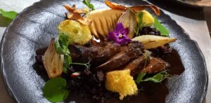 KOPYTKA, MODRA KAPUSTA, PUREE JABŁKOWE, SOS DEMI-GLACE TYMIANKOWY