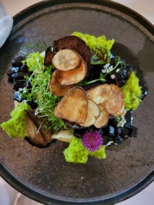 PUREE Z SELERA, KARMELIZOWANY BURAK, SZALOTKA, CHIPS Z TOPINAMBURU, SOS ORZECHOWY DEMI-GLACE